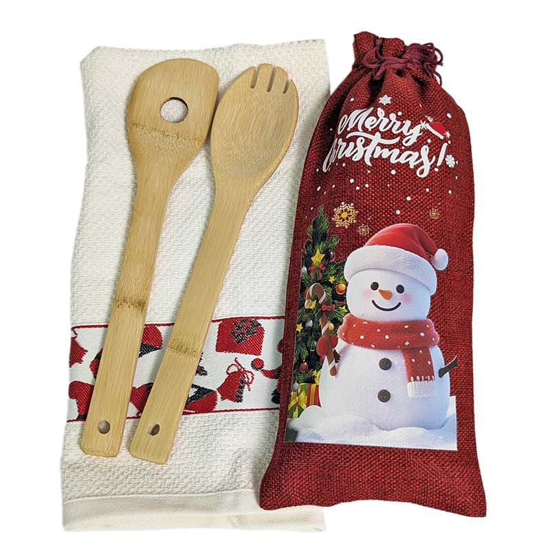 Perfetto come idea regalo natalizia, questa confezione speciale contiene un asciughino da cucina in 100% cotone di colore bianco con balza ricamata, morbido e assorbente, ideale per le tue preparazioni festive, e due pratici mestoli in legno di bambù, resistenti e ecologici.