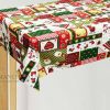 La tovaglia è decorata con un raffinato motivo natalizio, che include dolci dettagli come stelle, alberi di Natale e auguri festosi, creando un’atmosfera calorosa e accogliente.